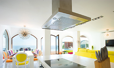 The roof is high and slanted to one side and is covered with grey ceramic tiles. One large chimney pokes out the center of the roof. Large, skylight windows let in plenty of light to the rooms below the roof.